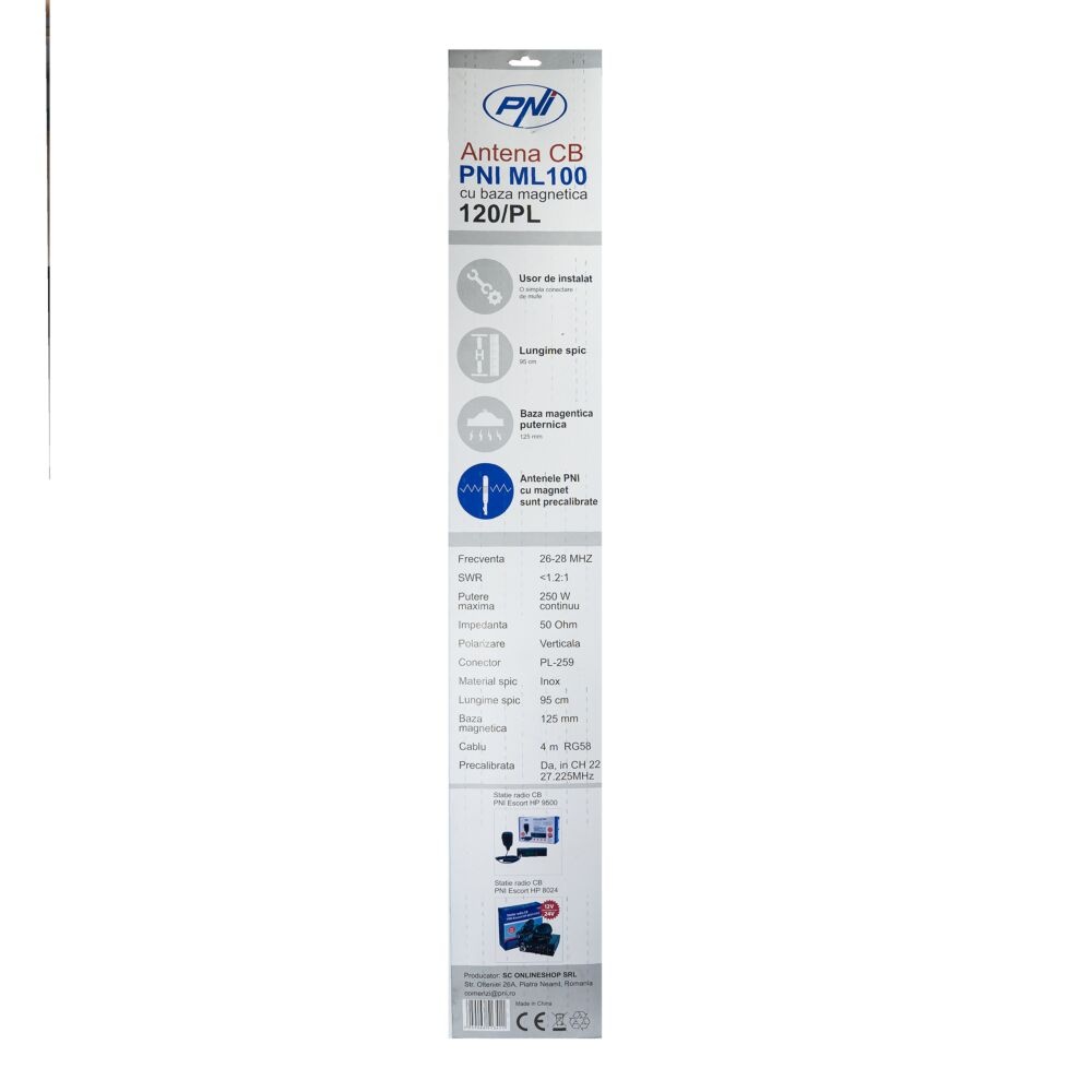 The CB PNI ML70 is an antenna with a 145 mm magnetic base specially designed for use in cars. It is extremely easy to install, either on the roof or in the boot of the vehicle. The maximum