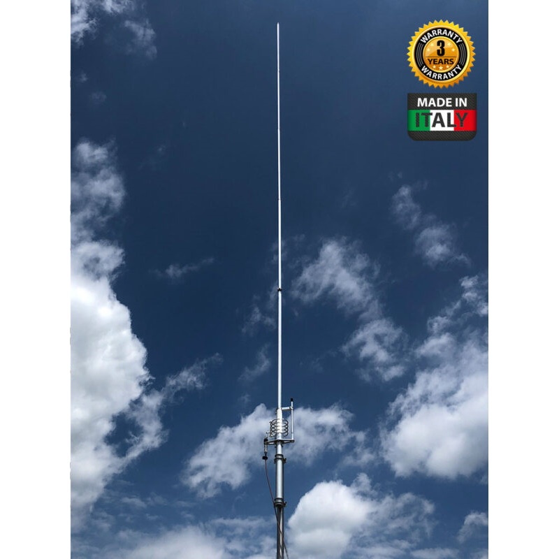 Grazioli FE10V 5/8λ omnidirectional CB antenna of 7.63m for the 10 (28MHz) or 11m (MHz) band. Ideal for outdoor transmissions. It has an adjustable frequency range of 26-30MHz and an unbalanced
