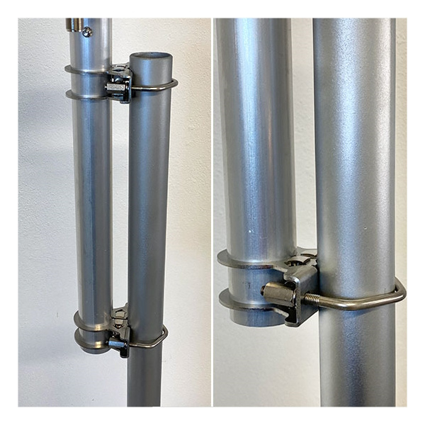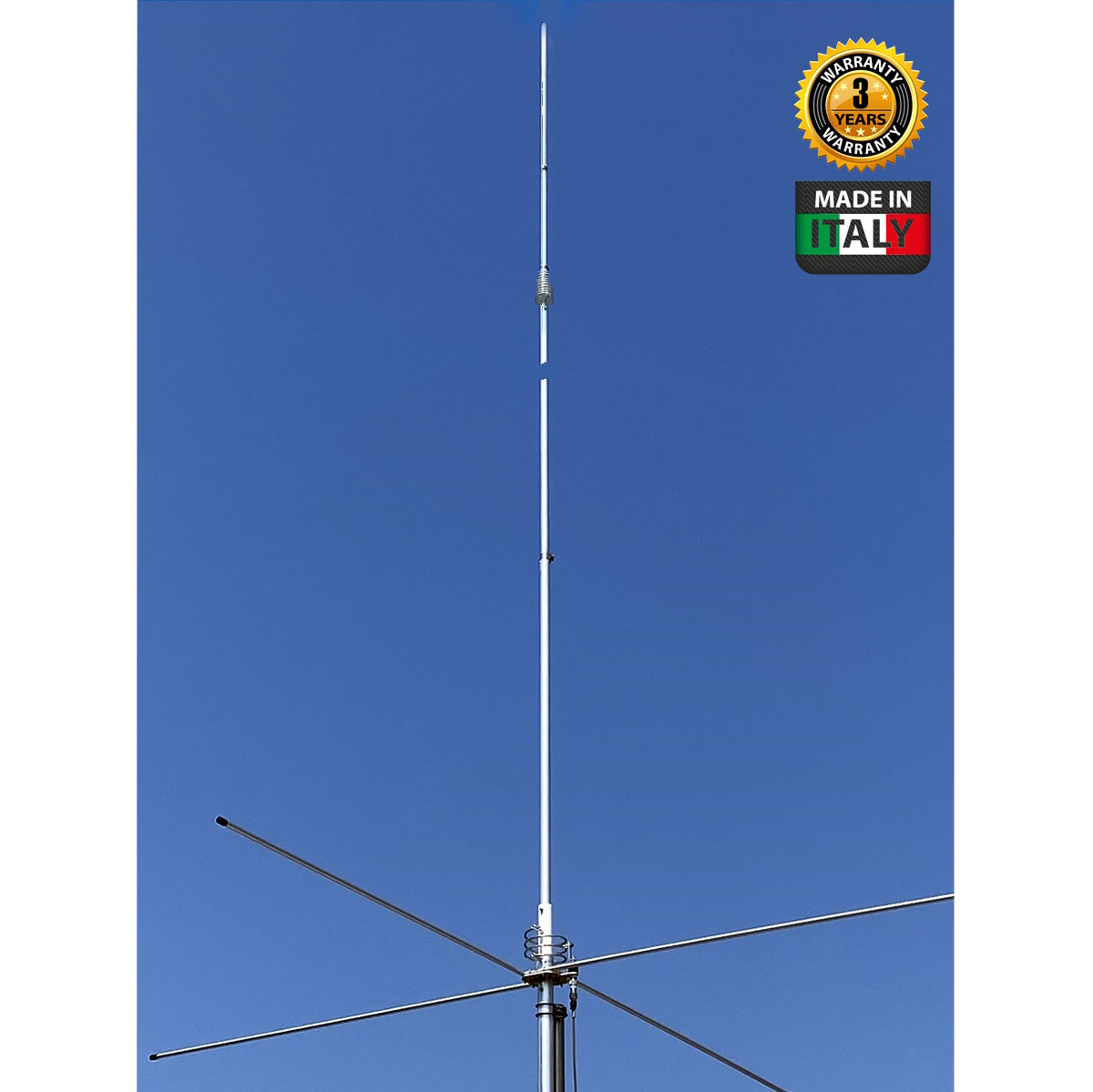 Robust ground plane: ground plane made up of 4 robust 1.4 m full quarter-wave radials fixed to the support plate with U-bolts and self-locking nuts. Fibreglass reinforcements strengthen the joints and prevent crushing.