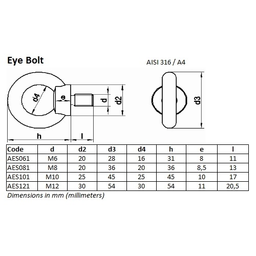 Stainless steel threaded nut ring 6 to 12 mm diameter (to be selected below)Strength: 780 daN, ~kg Working load 130 daN, ~kg