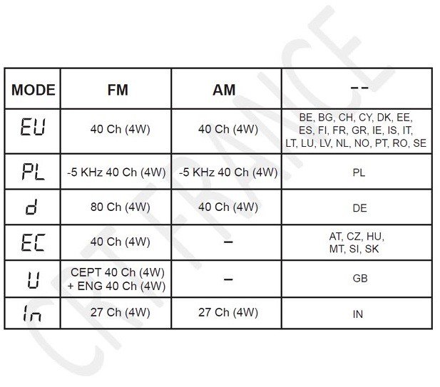 Midland ALAN-78PRO Mobile CB Transceiver Frequency range: 40 channels (26.965 - 27.405 MHz) Modulation modes: AM / FM Power output: 4 Watt AM / 4 Watt FM Power supply: Switchable 12 V / 24 VDC