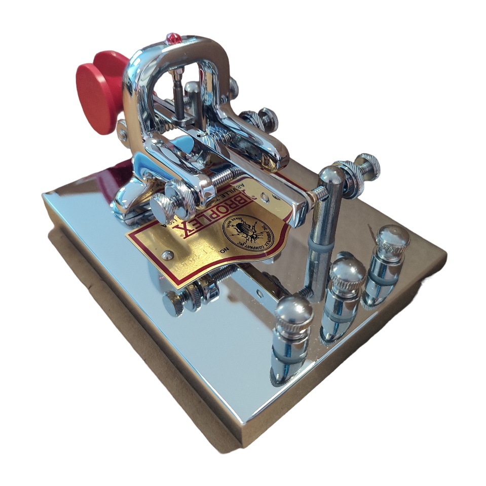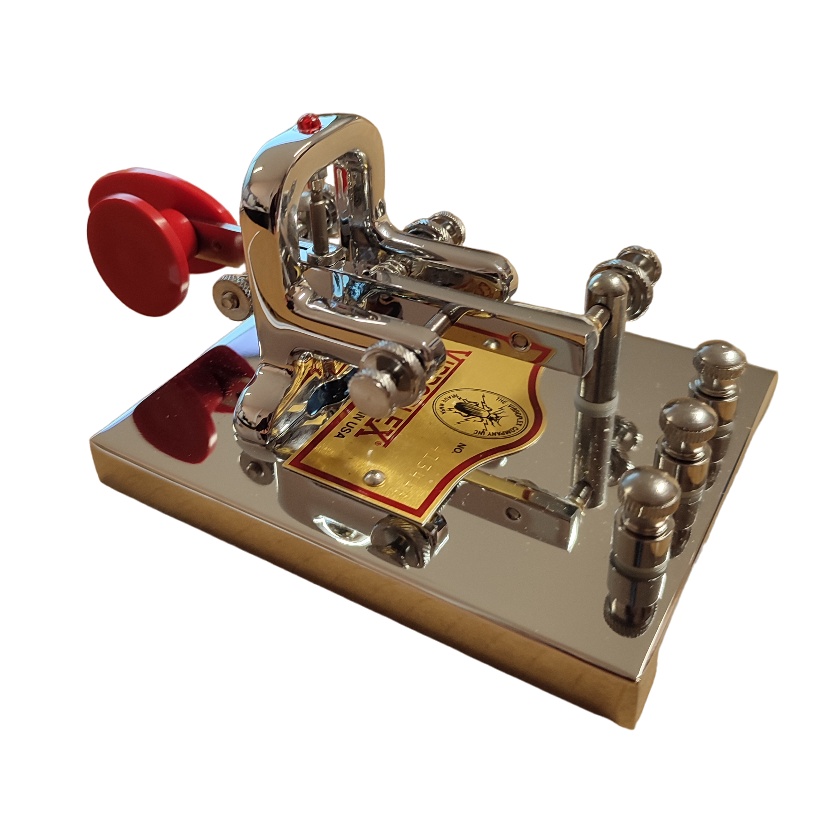 CW Vibroplex Straight Key Deluxe Manipulator, straight morse key with bright decorative chrome tops and base. The heavy 1.4kg solid steel base anchors the morse keyer in the operating position, while