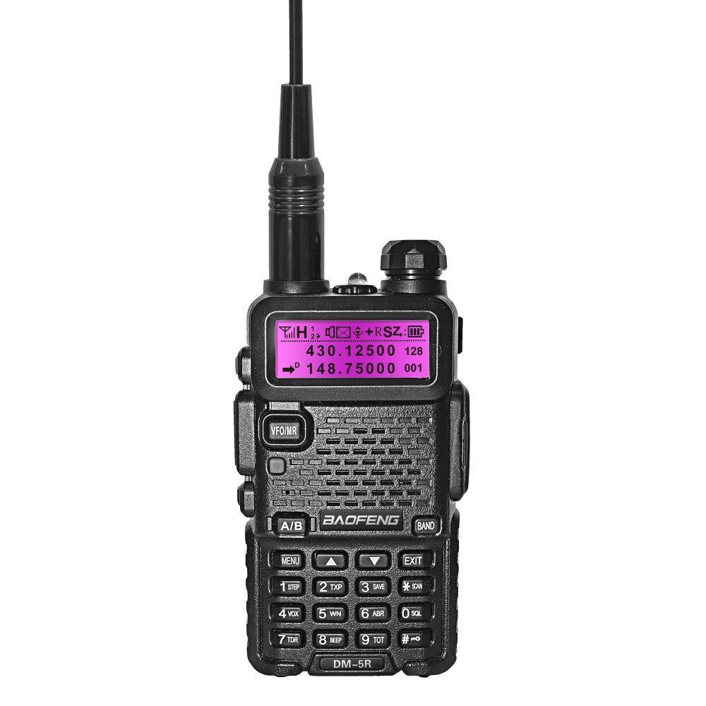 The DM-5R use same case and main features of the walkie-talkie UV-5R, VHF-UHF dual band, compact, RX and TX VHF 136-174MHz and UHF 400-480 MHz, 4 watts FM maximum, equipped with an 88-108Mhz FM radio and a led lamp.
