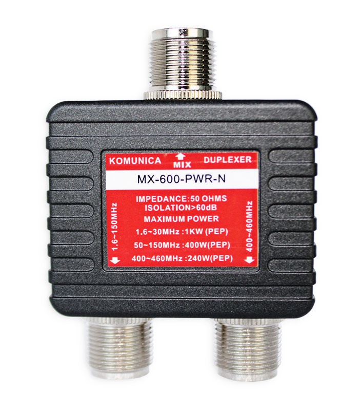 HF VHF UHF Duplexer Diamond MX72N. Passband width: LPF/1.6 to 30MHz 49 to 150MHz, HPF/400 to 460MHz (LPF:1.6 to 225MHz, HPF: 340 to 1000MHz receiving only) Power rating: 1.6 to 30MHz: 400W