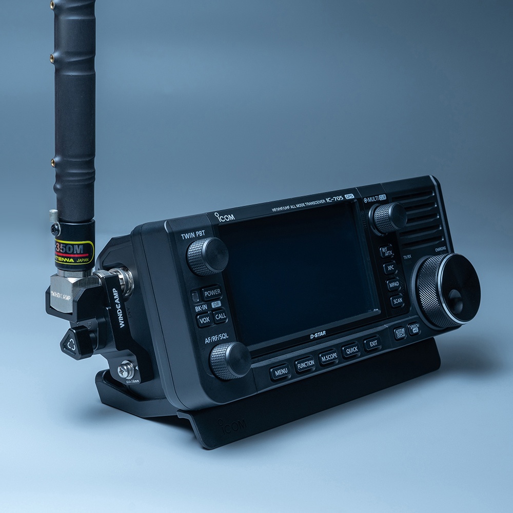 The RC-2 BNC version is a compact antenna support designed for the ICOM IC-705 QRP transceiver and for use with an antenna with a BNC connector. The vertical angle is adjustable, and the ARK-705