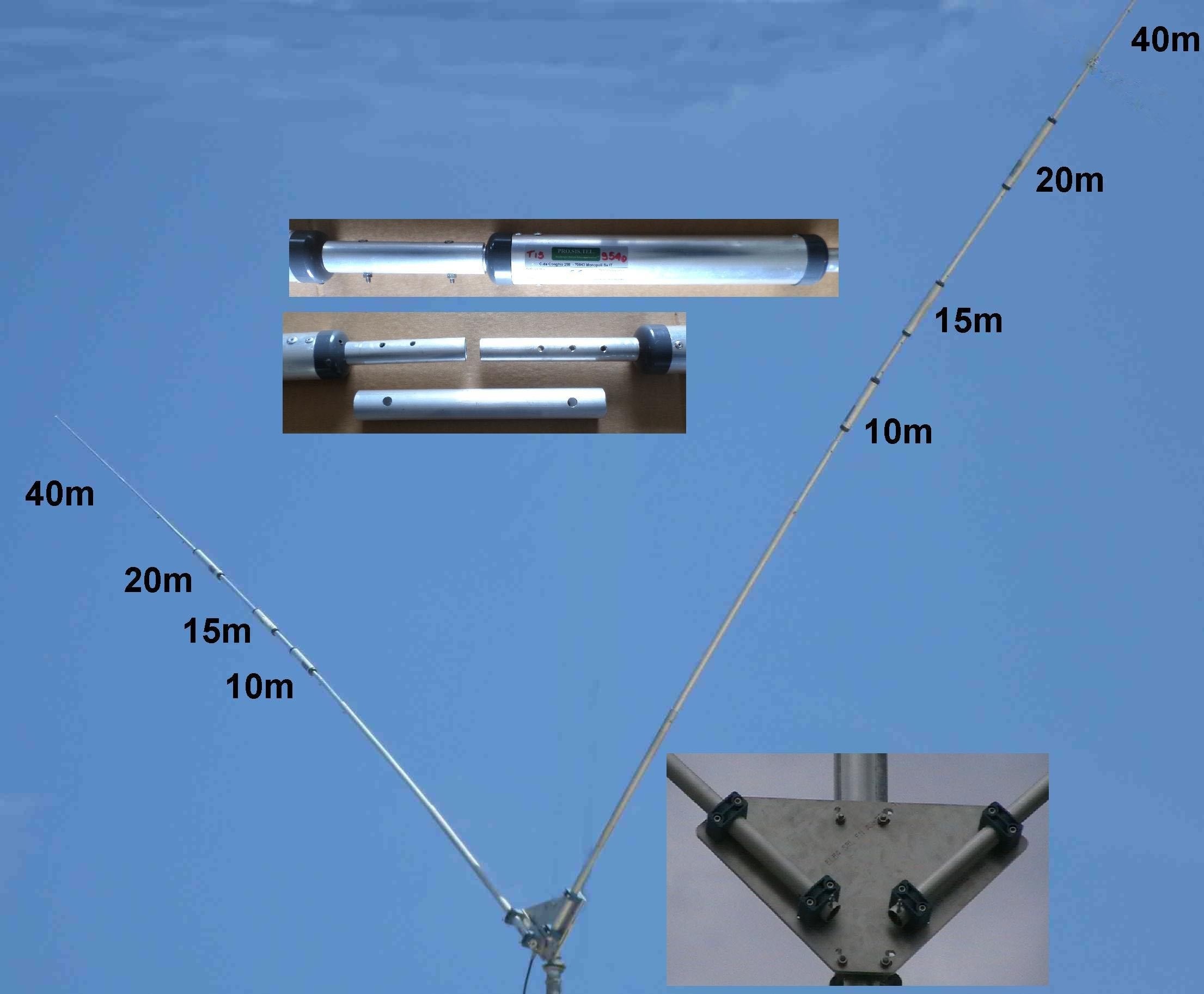 Trapped 10-15-20m multi-band dipole, omnidirectional V configuration 2KW pep Arm length: 4m, ground projection 3m per arm Can be mounted on 40 to 50 mm poles Suggested height: at least 5m, but also