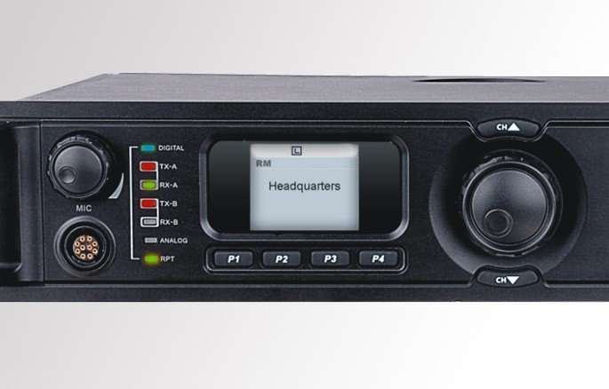 Hytera HM685 radio, digital DMR and analogue FM, single-band version VHF 136-174MHz or UHF from 400 to 470MHz, with a maximum power of 45W. Available with optional GPS and Bluetooth 5.0, and with a