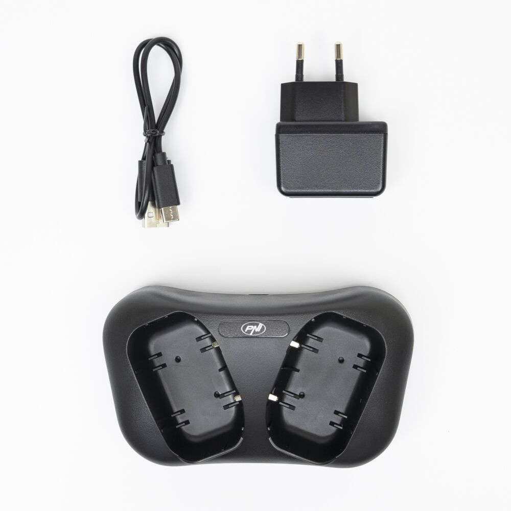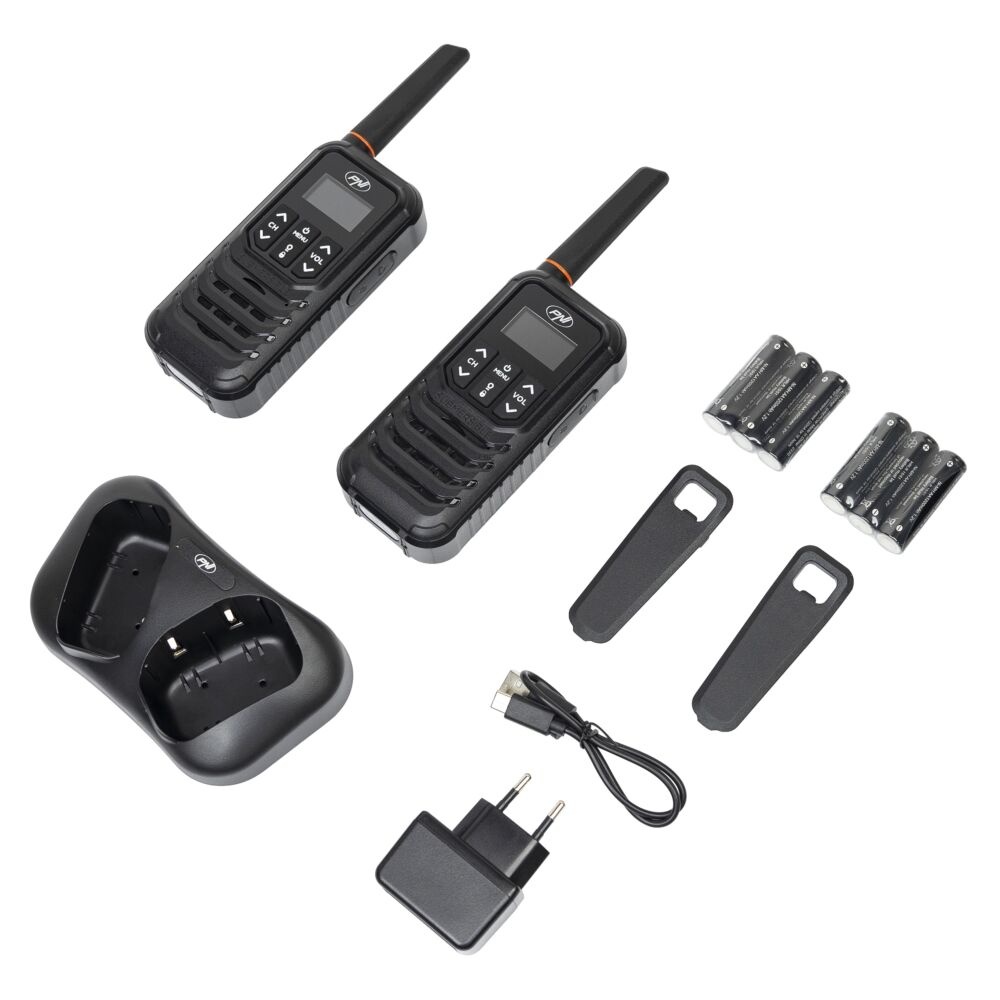 Supplied with: 2 PMR R80 PRO PNI radios, 2 7cm antennas, 2 1200mAh batteries, 2 belt clips, 1 dual desktop charger with USB-C cable and 1 user manual.