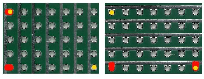 Perf2+ is a double-sided circuit board with perpendicular marks on each side. This unique design allows two hole/pad to easily relate to a welding bridge.