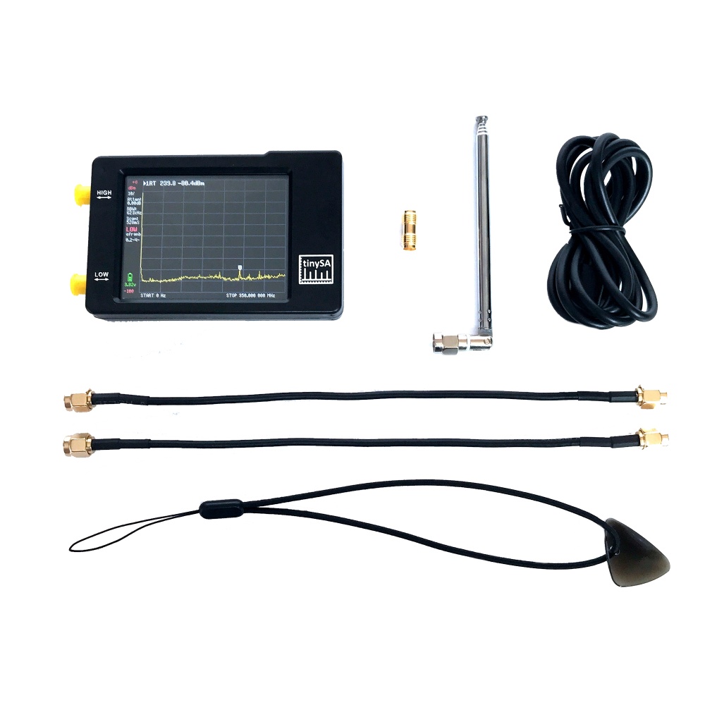 Supplied with: 1 TinySA with original warranty, 1 USB Type-C power cable, 2 SMA Male RG174 20cm cables, 1 SMA female - SMA female adapter.
