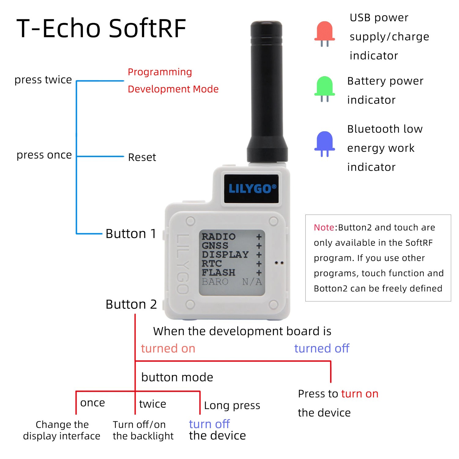 Supplied with: 1 LILYGO TTGO T-Echo with ABS case, 433MHz or 868MHz version (choose below), 1x 2pin 1.25mm battery cable, 1x USB TYPE-C cable, 1x 850mA battery, 1x Grey ABS case.