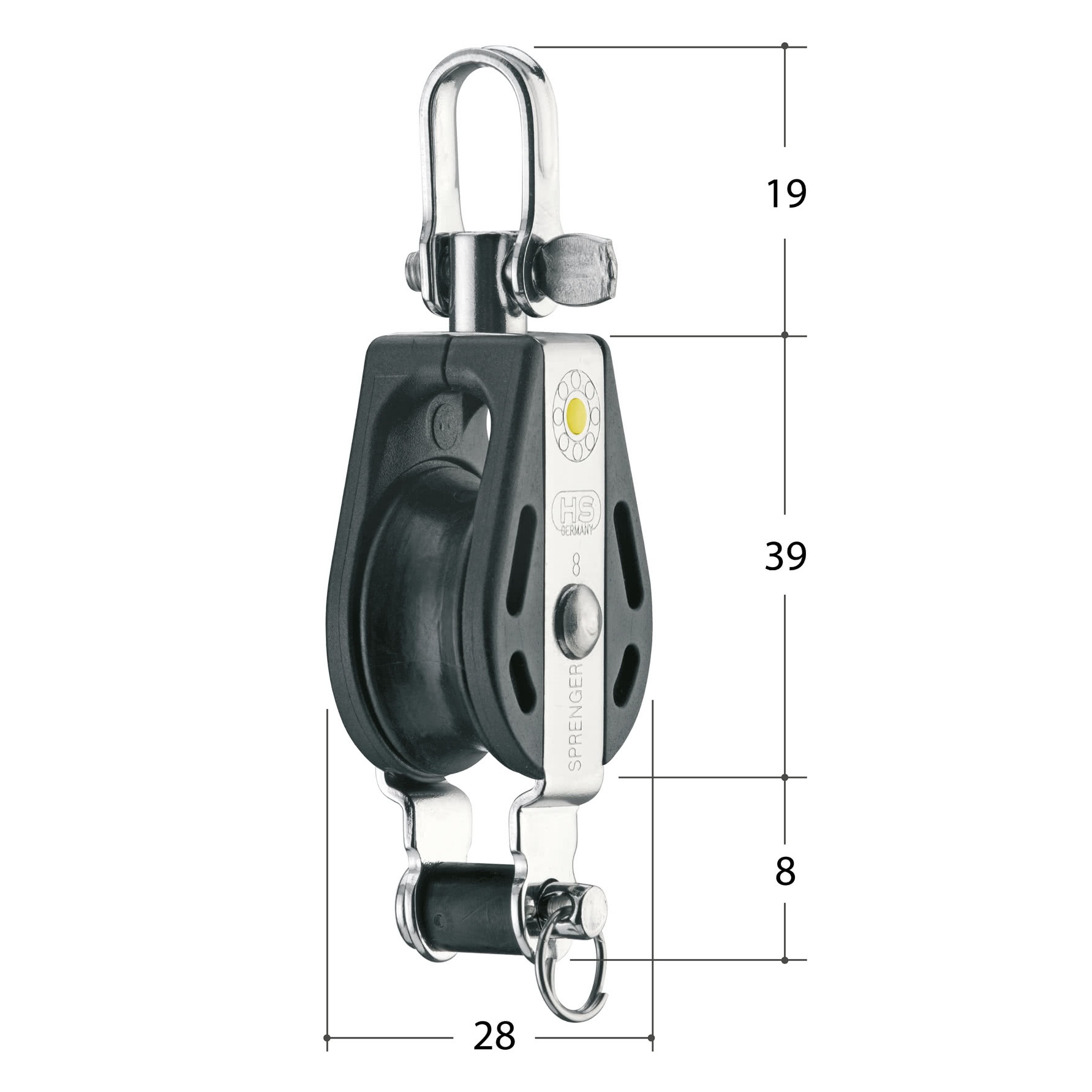 Single pulley 28.5 cm high and Ø 16mm, made of stainless steel (cheek piece and cage) and UV-resistant plastic, for guy rope up to 5 mm. Highly stressed sliding bearing, compact design and various