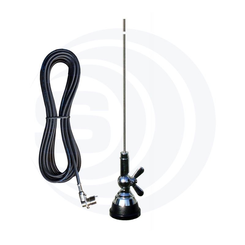 VHF...UHF 1/4 mobile antenna adjustable between 108 and 550 MHz. All-in-one. Includes radiator with bottom spring, base (S) and 5m of RG58 coaxial cable. Stainless steel radiator with spring at base.