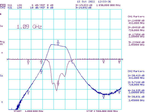 1090MHz +13.8dB, NF=0.67dB, RLin -15dB, IP3out >42dBm