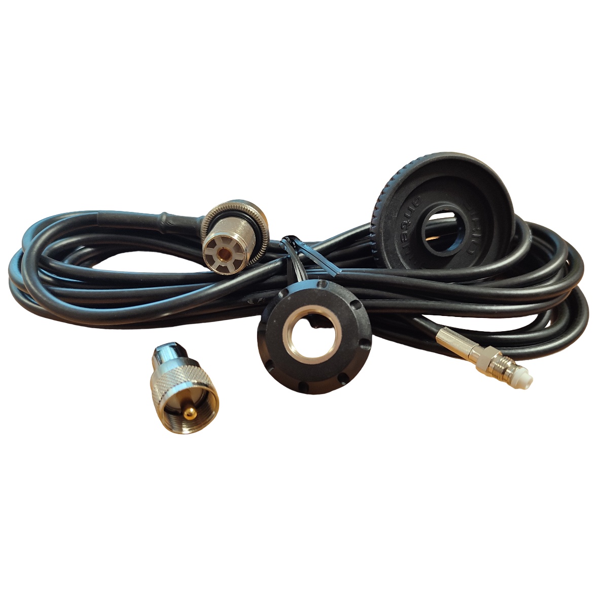 Screw-on base in SO-239 (UHF female) with 4 meter RG-316 coaxial cable and PL-259 connector (UHF male). The PL-259 connector at the end of the coaxial cable can be unscrewed to facilitate the passage