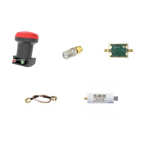 Comes with: 1 LNB PLL Bullseye 10 Ghz, 1 RTL-SDR USB stick TCXO, 1 Bias-Tee to supply the LNB head with 12V (SSB transponder) or 18V (DATV transponder) and 1 SMA Male - SMA Male pigtail of 15cm for connect the input of the Bias-T on the RTL-SDR key and 1 SMA Male - F female adapter to connect the 75 ohm TV coaxial cable between the LNB head and the RTL-SDR key (SMA female connector input).