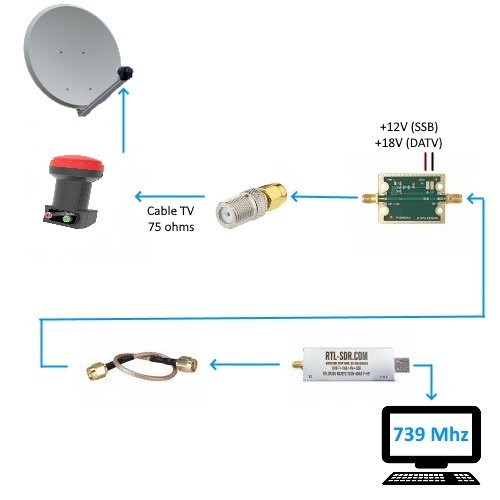 The RemoteQTH Pack includes a LNB PLL head modified with TCXO and 25Mhz quartz, as well as a bias-T power supply with adjustable attenuation and available in 2 versions: With a SDR stick on 739Mhz and