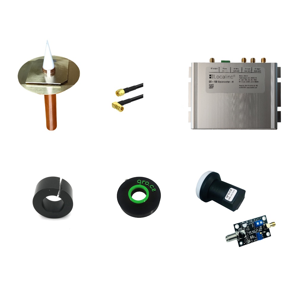 Supplied with: 1 Localino 2.4 GHz upconverter, 1 POTY antenna (with SMA connector), 1 KSR195 80cm low-loss cable with straight male SMA connector and angled SMA connector, 1 40mm/22mm reduction ring for fixing the POTY antenna tube to the support arm on the dish, an LNB head with 432MHz output and an adaptor for POTY.