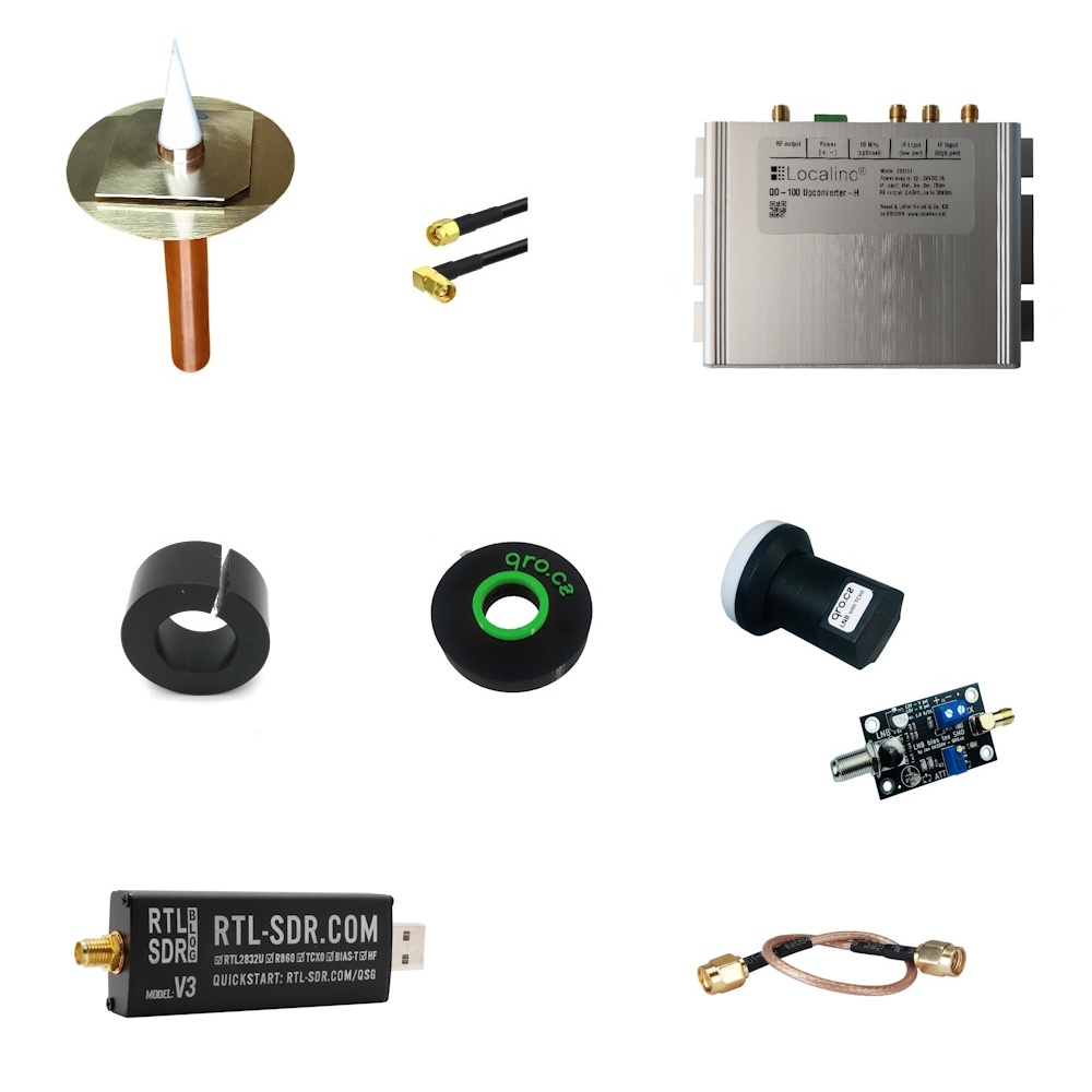 Supplied with: 1 x 2.4 GHz Localino upconverter, 1 x POTY antenna (with SMA connector), 1 x 80 cm KSR195 low-loss cable with straight male SMA connector and angled SMA connector, 1 x 40 mm/22 mm reduction ring for fixing the POTY antenna tube to the support arm on the dish, 1 x LNB head with 739 MHz output, 1 x adapter for POTY, 1 x RTL-SDR V3 key and 1 x 15 cm RG316 SMA male cable.