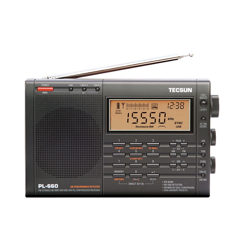 PL680 from TECSUN PLL DUAL CONVERSION SSB RADIO RECEIVER WITH AIR BAND (VHF).FM: 76-108 MHz LW: 100-519 kHz MW (AM): 520-1710 kHz SW: 1711-29999 kHz AIR: 118-137 MHzFM-stereo / MW / LW / SW SSB /