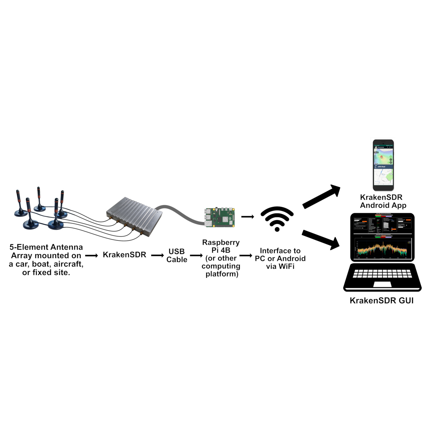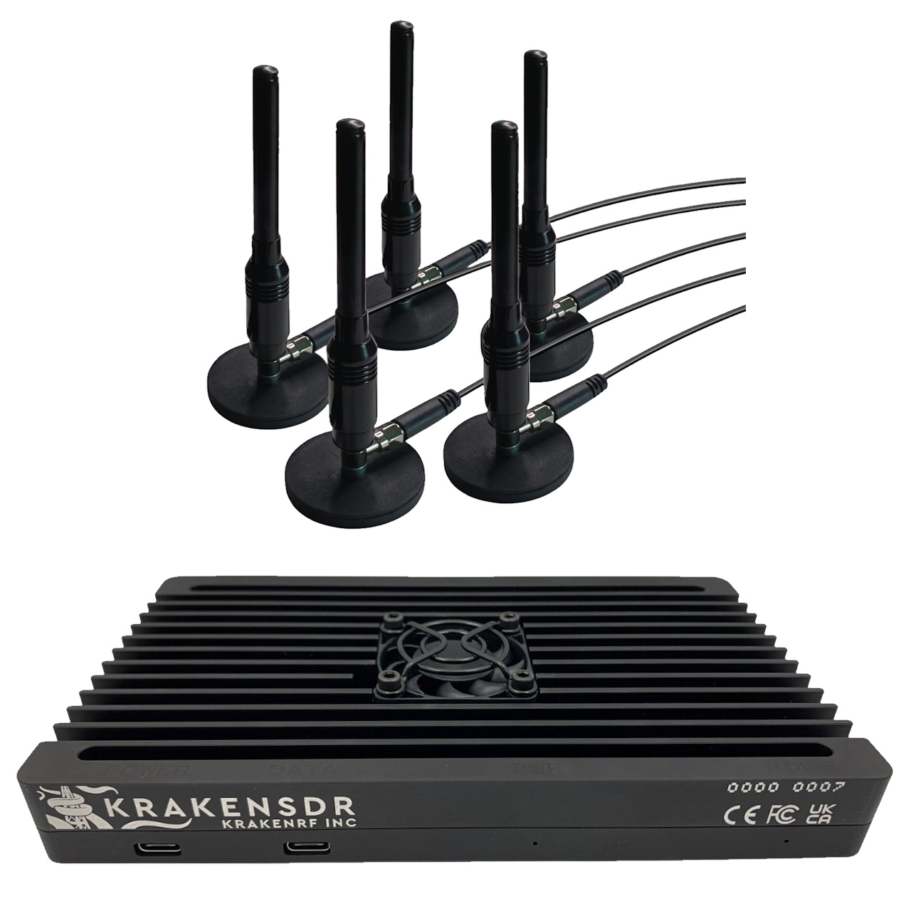 The KrakenSDR is a five-channel synchronised SDR receiver designed for radio direction finding and triangulation, analysis and steering of radio frequency signals. Based on the RTL2832U chip and the