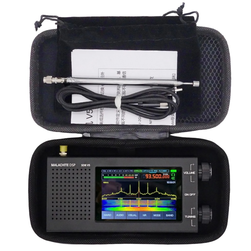 Scope of delivery: 1 Malachite DSP SDR V5 receiver, 1 70CM telescopic antenna, 1 EVA protective bag, 1 USB-C data cable, and a carrying case.