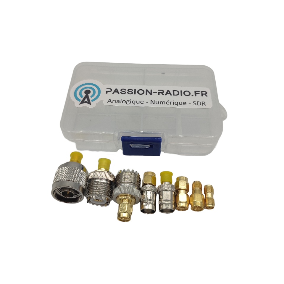 Connectivity pack of 5 UHF input RF adapters with PASSION RADIO carrying case. Supplied with: 1 x SO239 (UHF female) to SO239 adapter, 1 x SO239 to SMA female, 1 x PL259 (UHF male) to PL259, 1 x SO239