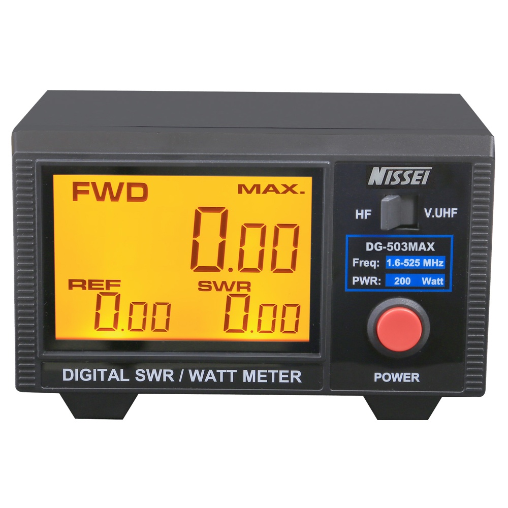 Read the 7 reviewsThis Nissei DG-503MAX Wattmeter has a digital display with a backlit screen. It measures SWR for HF frequencies from 1.6 to 60 MHz and VHF-UHF frequencies from 125 to 525 MHz, as well as power up to 200W.