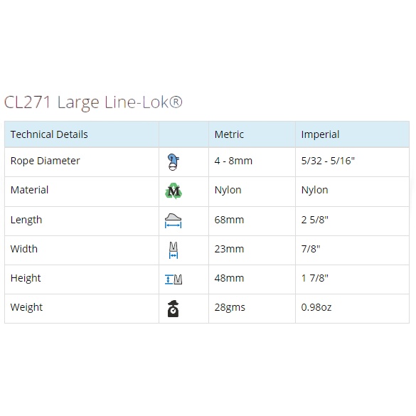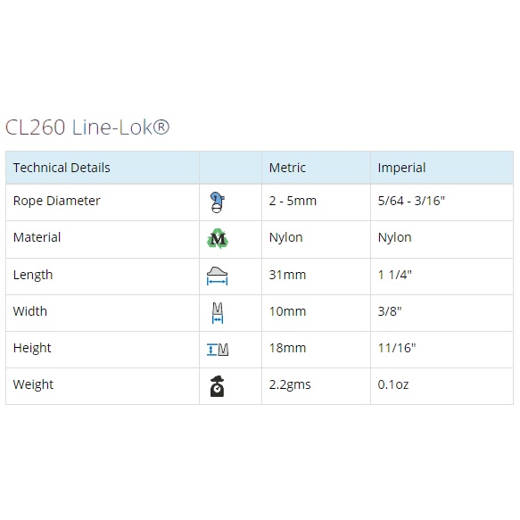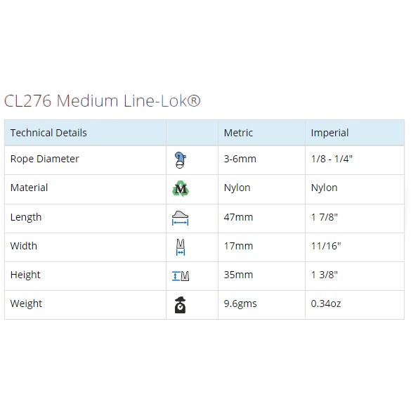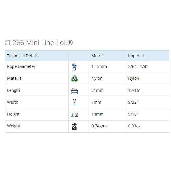 Clamcleat loop tensioner for rope diameters from 3 mm (1/8") to 6 mm (1/4"). Black colour. UV stabilised nylon.Attached to a rope, the CL223 is quick to tension, easy to adjust and easy to release.
