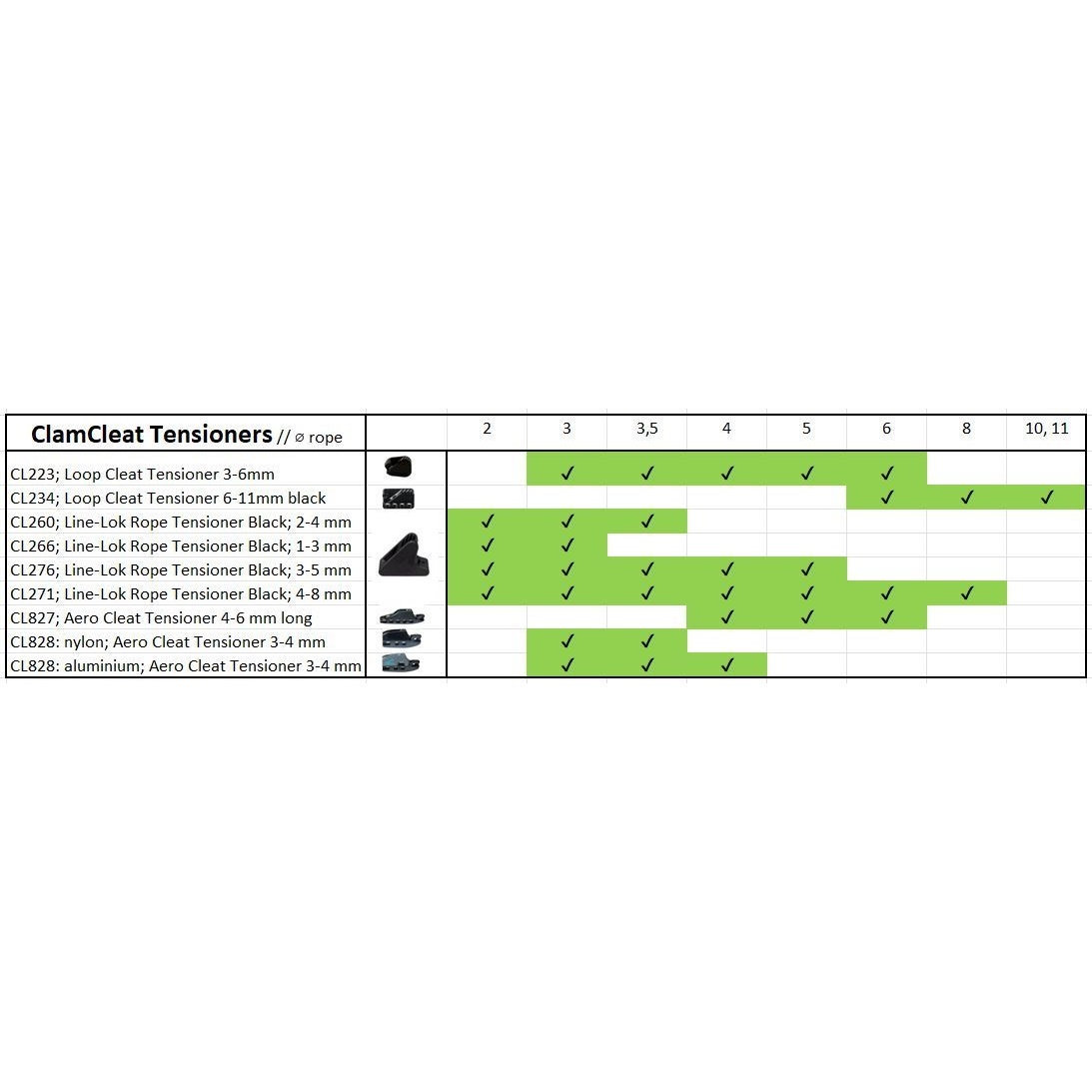 Clamcleat loop tensioner for rope diameters from 3 mm (1/8") to 6 mm (1/4"). Black colour. UV stabilised nylon.Attached to a rope, the CL223 is quick to tension, easy to adjust and easy to release.