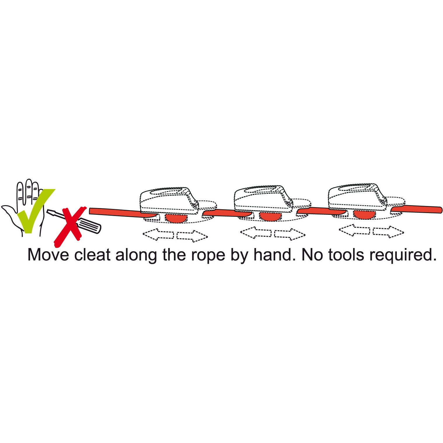 The position of the cleat on the rope can be adjusted by hand. No tools are required, ideal for light loads.