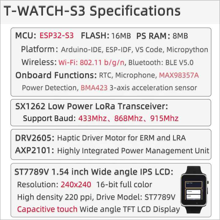 Read the reviewConnected watch with ESP32-S3 and LoRa SX1262 868MHz module. Perfect for portable mesh communications and geolocation applications.