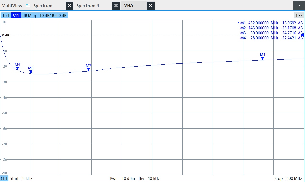 The SV4401A is a portable vector network analyser (VNA) with a frequency range of 50kHz to 4.4GHz. It can be used for both S11 and S21 measurements. The S21 dynamic range is 75 dB, while the S11