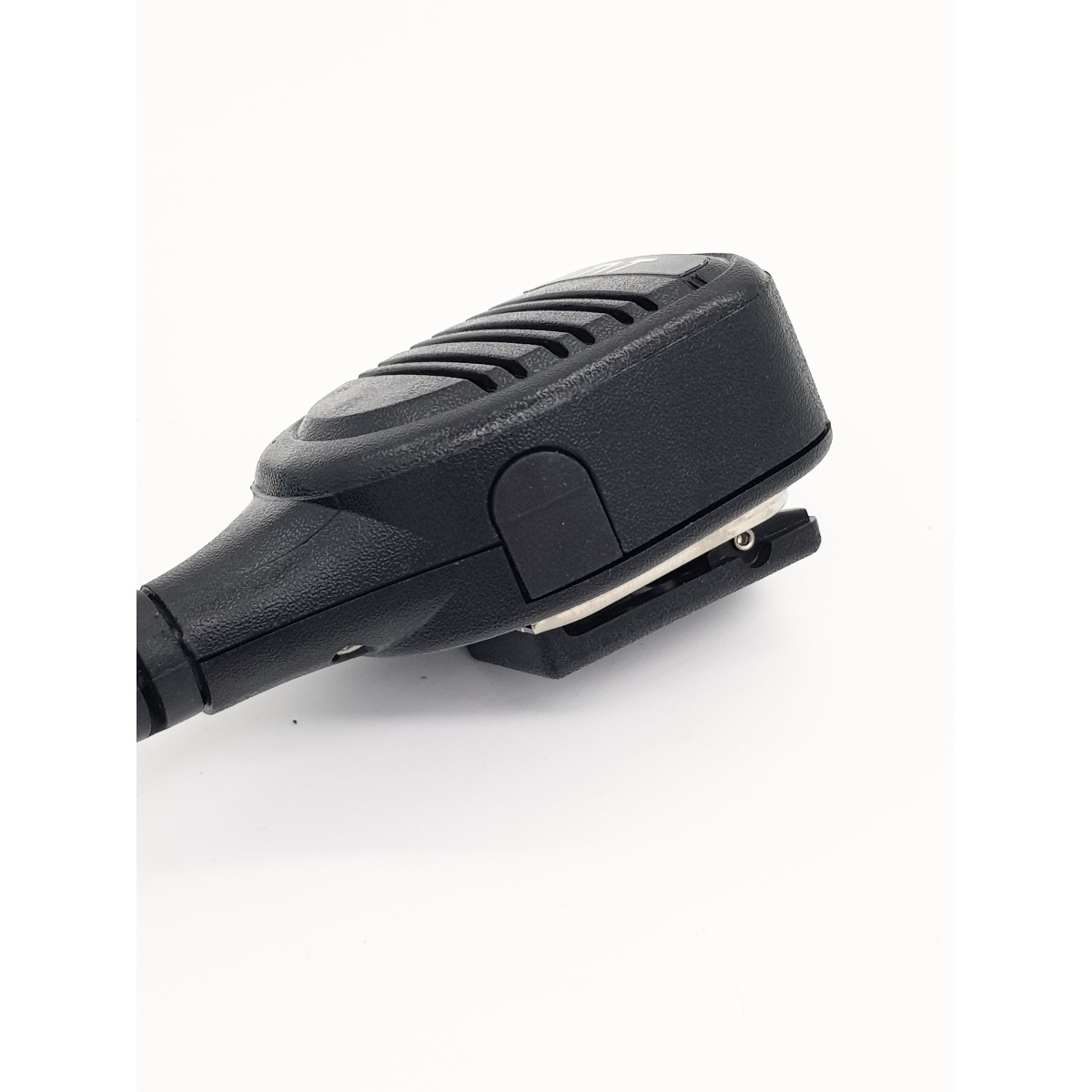 The clip on the back of the microphone can be rotated through 180°, and the speaker volume can be adjusted from the walkie-talkie. A red light indicates when you are transmitting.