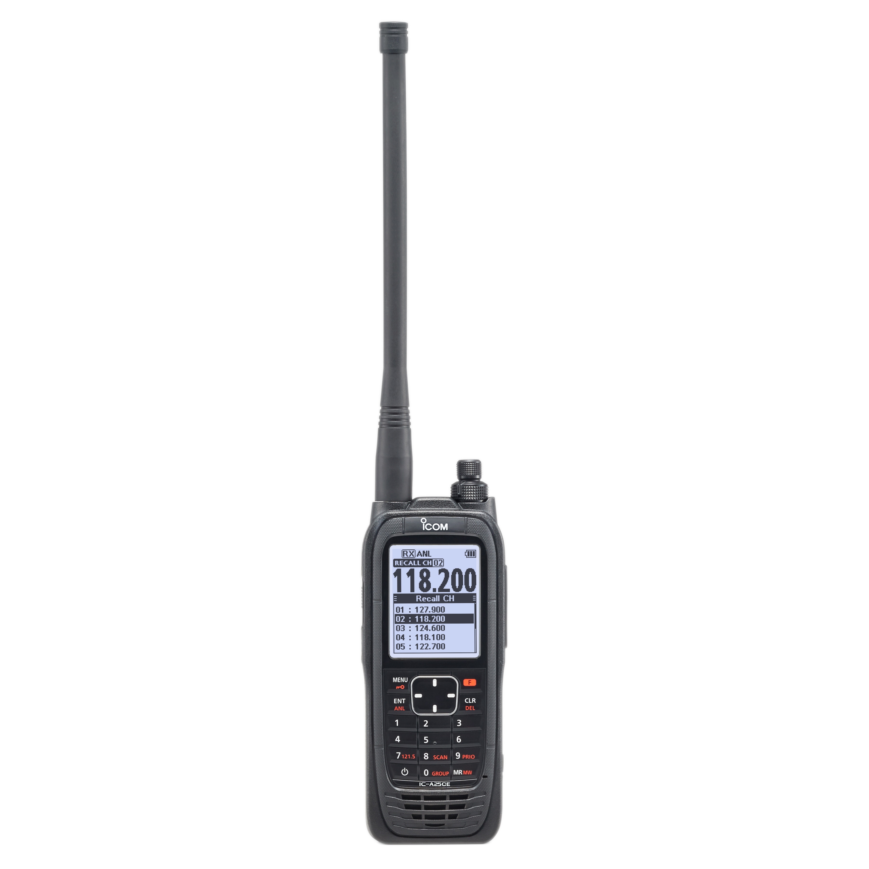 ICOM IC-A25NE aviation handheld VHF 108-136MHz, 6W PEP, graphic display, keypad, 200 channels, 8.33kHz spacing, IP57 waterproof. With VOR, Bluetooth and navigation functions with integrated GPS. Meets