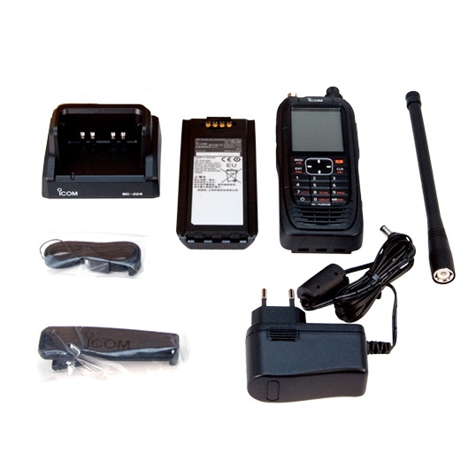 Delivered with: 1 IC-A25NE, 1 Li-ion battery 7.2 V 2350 mAh, 1 battery pack 6 x LR6 AA (not included), 1 flexible antenna, 1 220 V power supply, 1 quick charger, 1 wrist strap, 1 belt clip and a manual (FR/EN/ES) to download below.