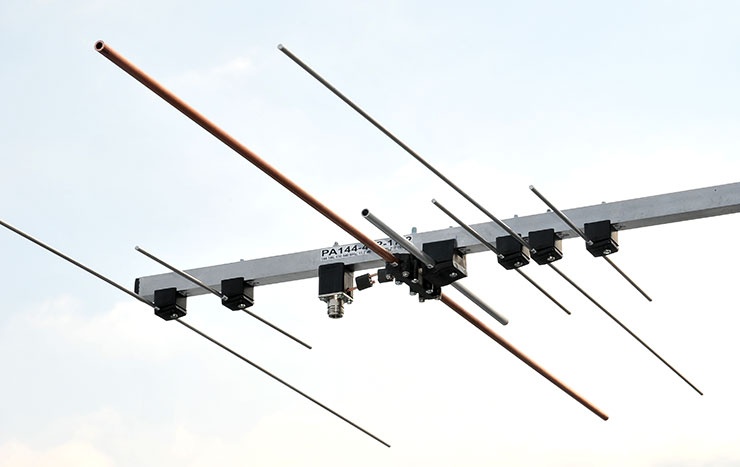 Light Weight Excellent Gain Dual Band Yagi Antenna 2m70cm25DXA-2C (former PA144-432-25-4.5-2CAP). Maximum power input 1500 W on 144-145 MHz with 9 active elements and 850 W on 432-434 MHz with 16