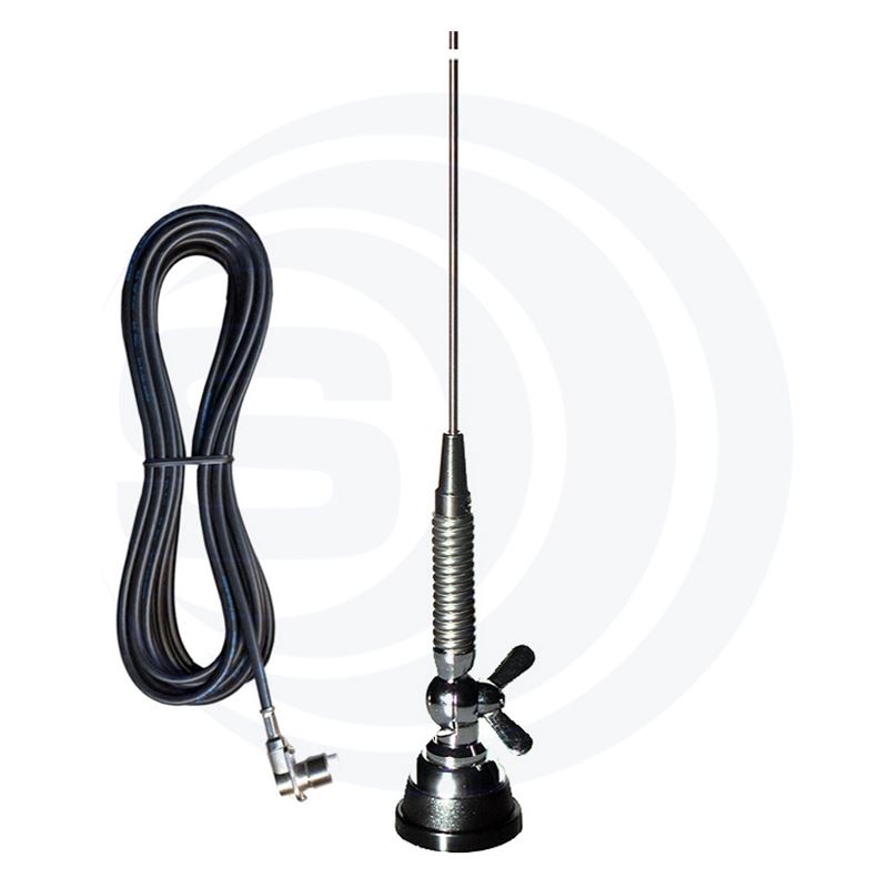 VHF...UHF 1/4 mobile antenna adjustable between 108 and 550 MHz. All-in-one. Includes radiator with bottom spring, base (S) and 5m of RG58 coaxial cable. Stainless steel radiator with spring at base.