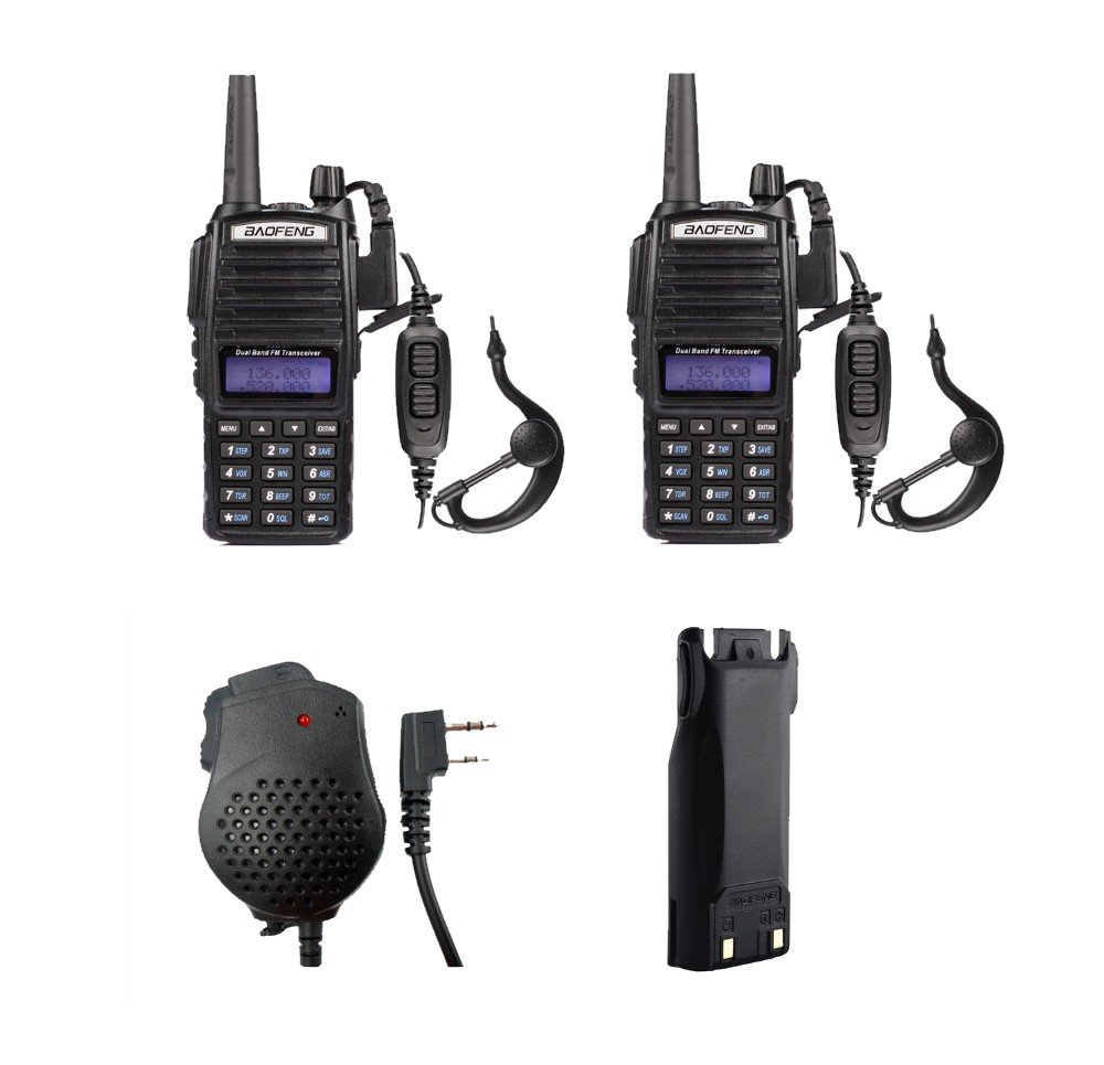 No review at the momentThis pack includes 2 Baofeng UV-82 walkie-talkies, dual band VHF-UHF, from 136 to 174MHz and 400 to 520MHz with 5 watts FM (maximum), with dual PTT and dual watch frequency, and come with 2 hand-microphones, 4 high-capacity batteries 2800mAh and the programming cable.