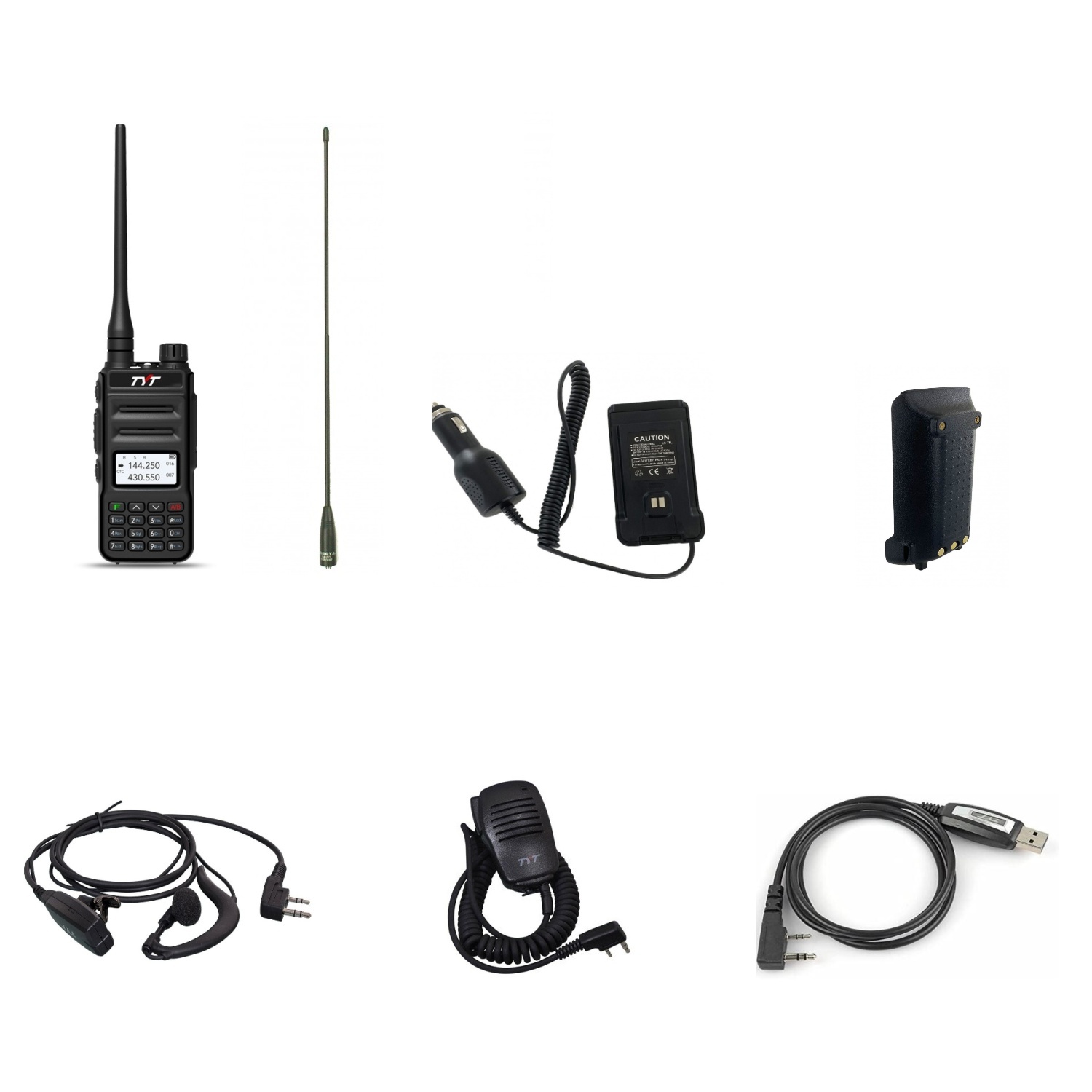 It includes 1 TYT TH-UV88 walkie-talkie covering the FM band from 144 to 146MHz (5 Watts) and from 430 to 440MHz (4 Watts) and the following accessories: 1 Nagoya NA-771 (39cm) antenna in SMA male, 1 battery 1400mAh, 1 battery HP 3200mAh, 1 hand-held microphone with built-in speaker, 1 headset and 1 USB programming cable.